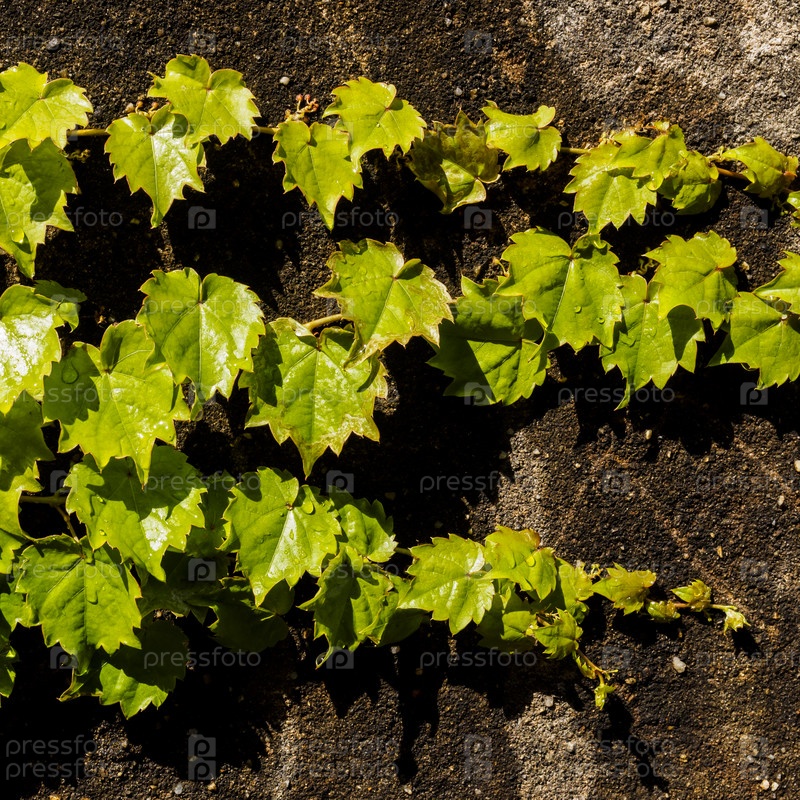 Зеленые сочные виноградные листья с каплями на каменной стене. Шаблон естественного летнего фона