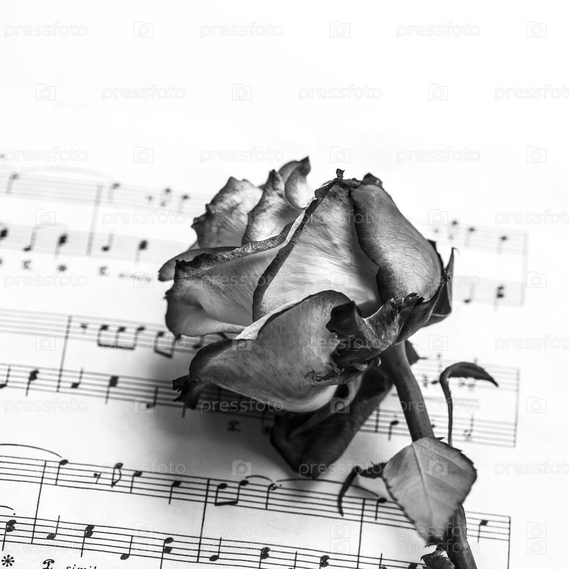 Нотный лист с сухой мертвой розой. Идея концепции любви к музыке, музыкальное вдохновение