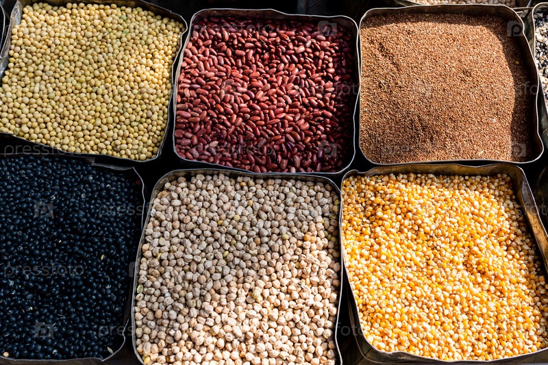 Органические сушеные бобы, кукуруза, маш, нут на фермерском рынке. Здоровая веганская еда