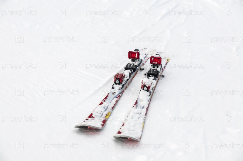 Пара красных лыж на белом снегу. Австрия