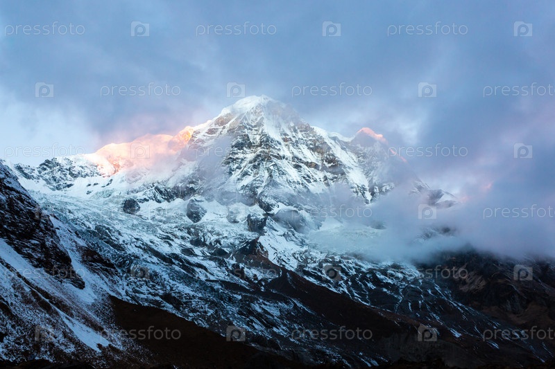 Первые солнечные лучи, освещающие пик Южной горы Аннапурны (7219 м) на восходе солнца, базовый лагерь Аннапурны, заповедник Аннапурны, Гималаи, Непал