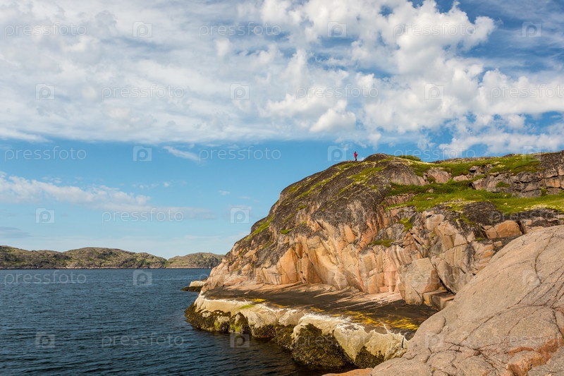 Каменное побережье Баренцева моря, скалы, покрытые мхом и лишайником. Северное полярное лето в тундре. Северный Ледовитый океан, Кольский полуостров, Россия