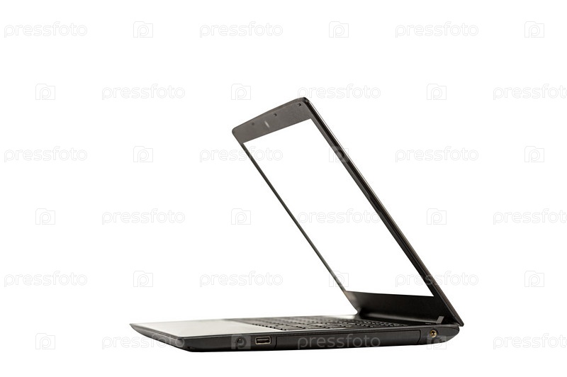 Ноутбук в угловом положении с пустым экраном на белом фоне