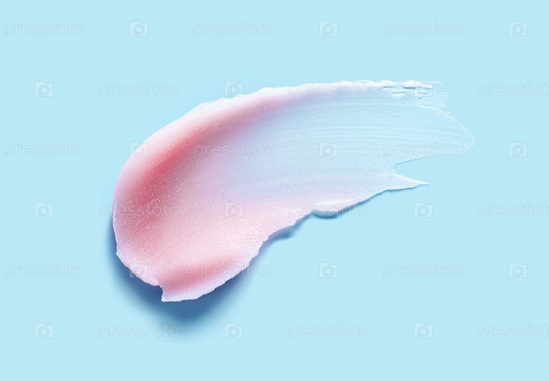 Косметический розовый бальзам для губ, соль или сахарный скраб, образец косметической маски на синем фоне