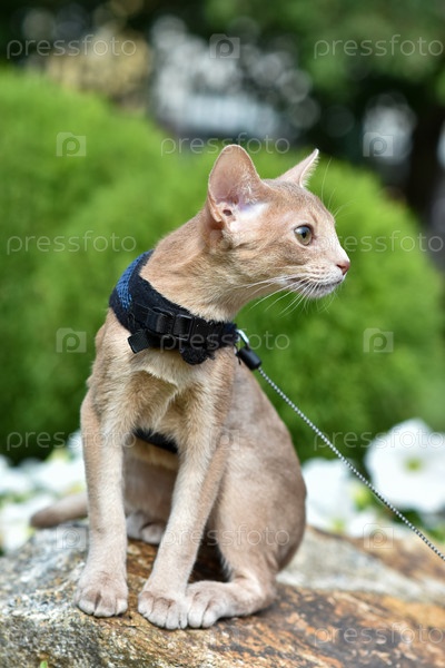 Молодой абиссинский кот окраса Фавн с поводком гуляет по двору. Прогулки с домашними животными, приключения в парке