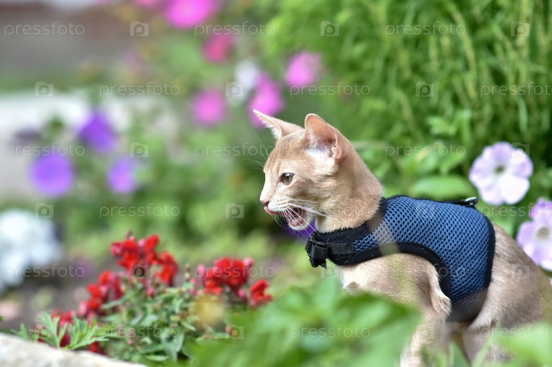 Молодой абиссинский кот окраса Фавн с поводком гуляет по двору. Прогулки с домашними животными, приключения в парке