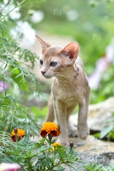 Молодой абиссинский кот окраса Фавн с поводком гуляет по двору. Прогулки с домашними животными, приключения в парке