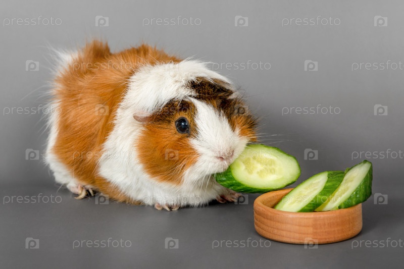 Розетка морской свинки на сером фоне. Пушистая милая морская свинка грызунов ест огурец на цветном фоне