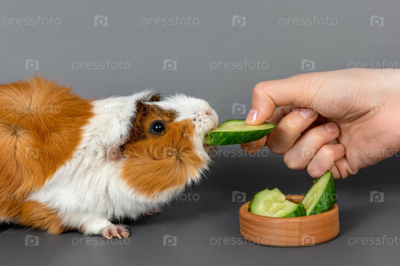 Розетка морской свинки на сером фоне. Пушистая морская свинка-грызун ест огурец из женской руки на цветном фоне