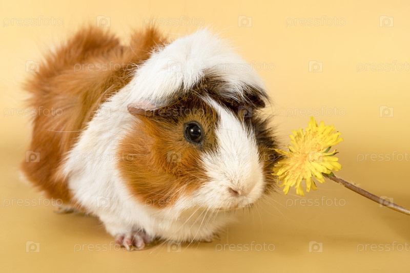 Розетка морской свинки на бежевом фоне. Пушистая морская свинка грызунов ест цветок одуванчика на цветном фоне