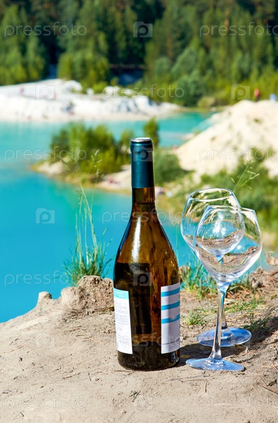 Бутылка вина и бокалы на берегу голубого залива. Концепция праздника и пикника, и романтического вечера на море в жаркий солнечный день