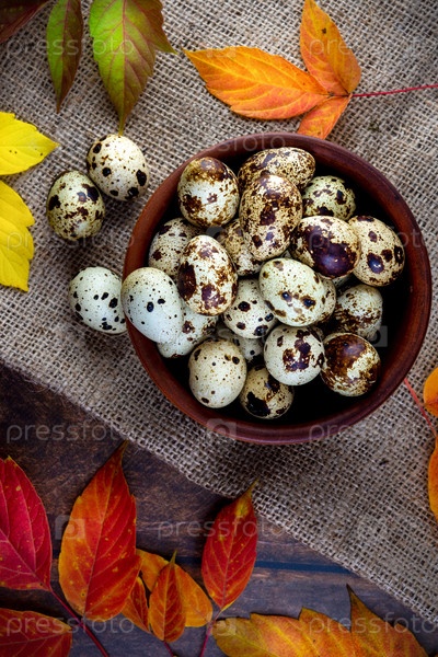Перепелиные яйца в керамической миске с осенними листьями на темном фоне