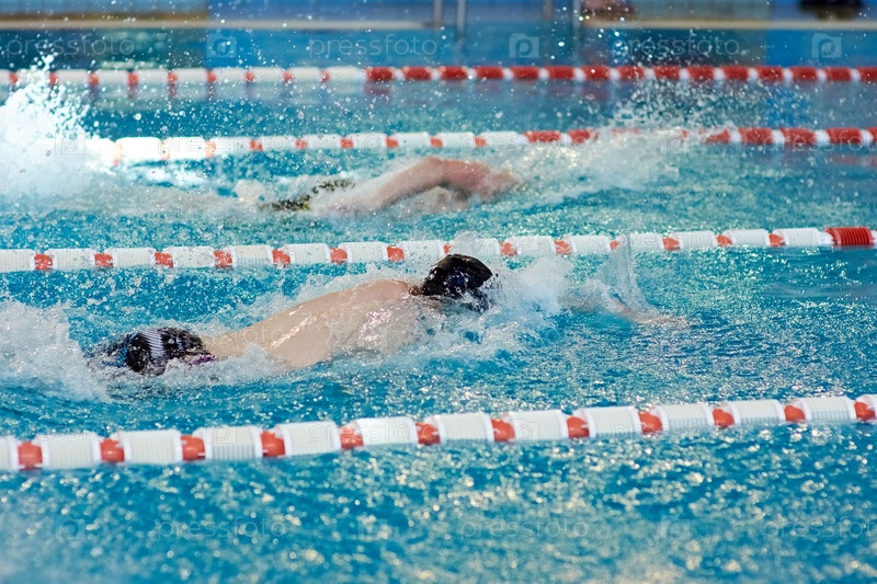 Пловец в шапочке вытягивает руки во время тренировки брассом в бассейне, размытый фокус