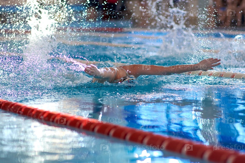 Пловец машет руками, выполняя баттерфляй на тренировке в бассейне, размытый фокус