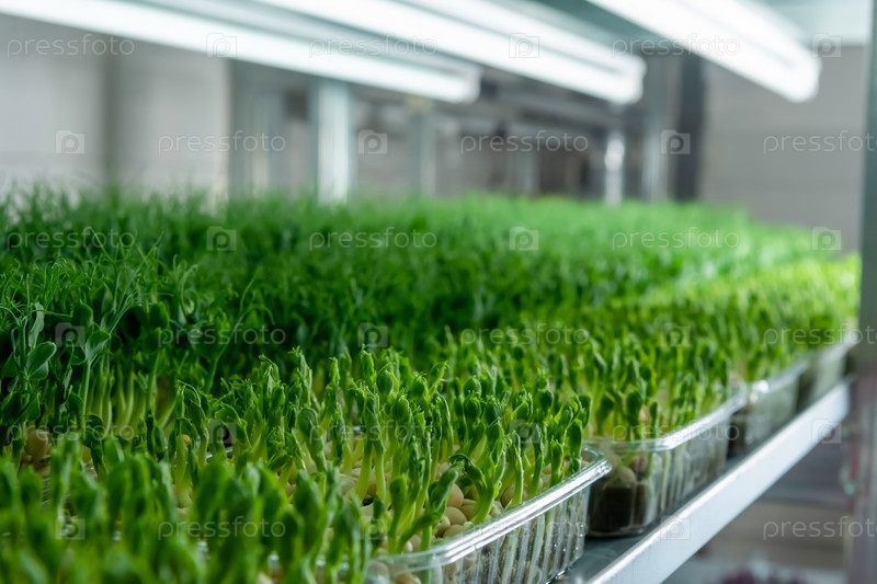 Сочные молодые побеги микрозелени крупным планом. Выращивание семян в теплице. Ферма микрозелени. Производство экологически чистого витаминного питания