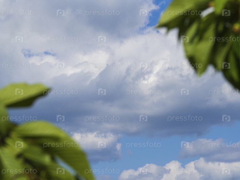 Абстрактный летне-весенний фон облаков в небе и расфокусированные зеленые листья по краям