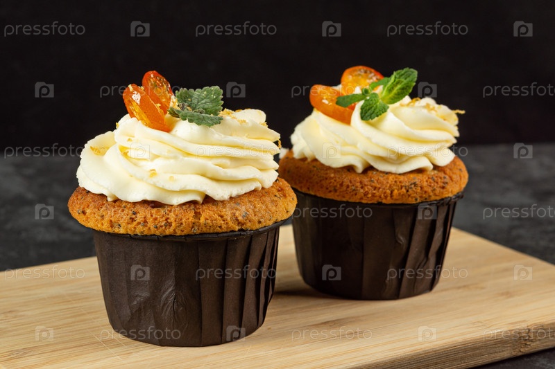 Кексы с сырным кремом, украшенные сладкими ягодами на темном фоне