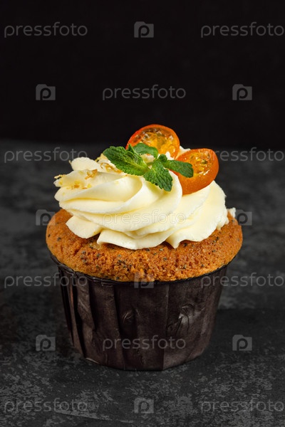 Кексы с сырным кремом, украшенные сладкими ягодами на темном фоне. Макет для дизайна