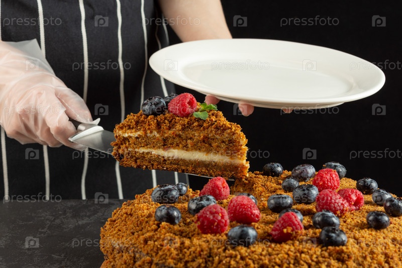Шеф-повар печет и ест кусок домашнего морковного пирога на темном фоне