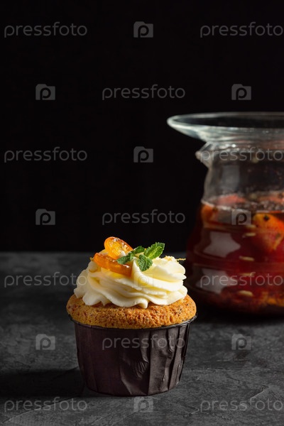 Кексы с сырным кремом, украшенные сладкими ягодами на темном фоне