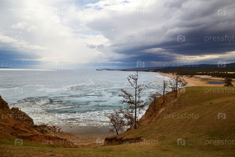 Озеро Байкал в пасмурный весенний день. Грозовое небо, Сарайская бухта во время таяния льда. Остров Ольхон