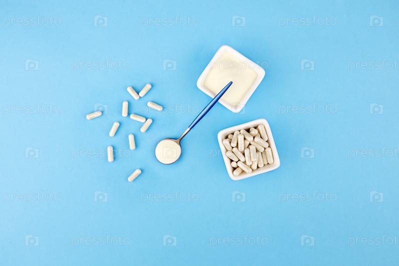 Коллагеновый протеиновый порошок и капсулы в банке, в ложке на синем фоне