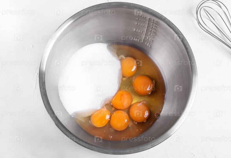 Пошаговый рецепт бисквита. Шаг 3. Смешайте яйца и сахар в металлической миске, чтобы получилось тесто. Вид сверху