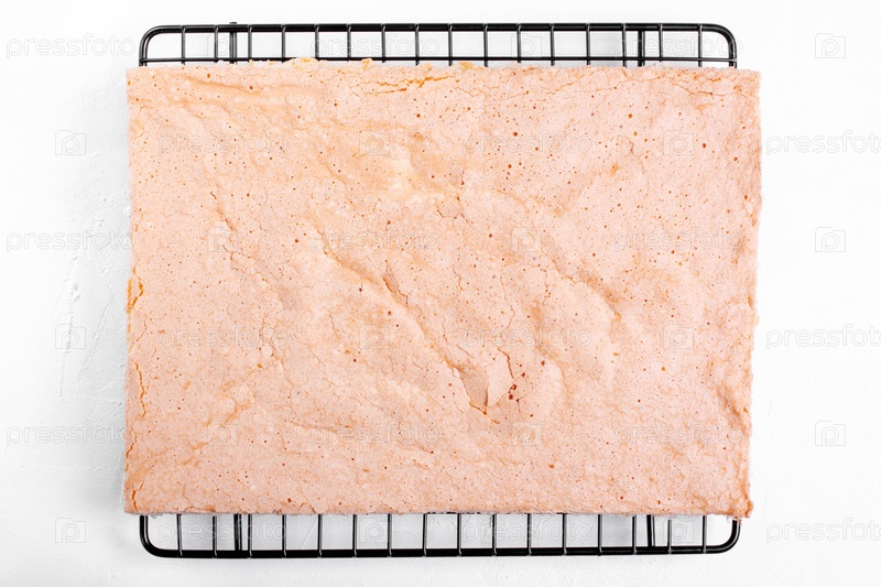 Бисквит остывает на пирожной решетке на белом столе. Вид сверху