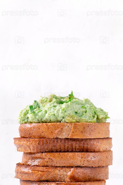 Паштет с зеленым горошком на стопке поджаренного отрубного хлеба на белом фоне. Копировать пространство