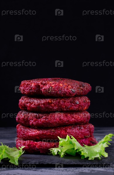 Веганские бургеры из свеклы в стопке на темном фоне. Здоровая альтернатива. Скопируйте пространство. Фотография в низком ключе