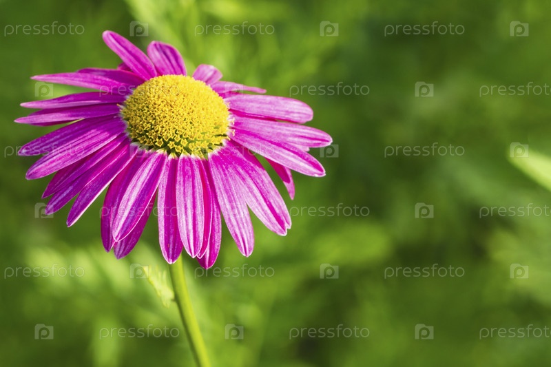 Розовый цветок на зеленом фоне. Крупный план красочной розовой ромашки на зеленом фоне в солнечный день в саду