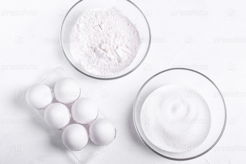 Ингредиенты для приготовления бисквита. Яйца, сахар и мука на белом столе. Пошаговый рецепт бисквита. Шаг 1. Набор белых ингредиентов. Вид сверху