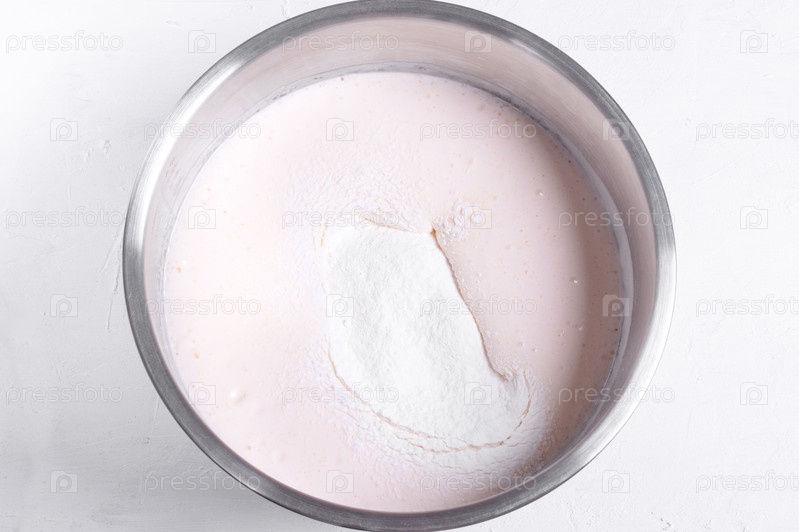 Пошаговый рецепт бисквита. Шаг 6. Муку добавить в смесь яиц и сахара в металлической миске. Вид сверху