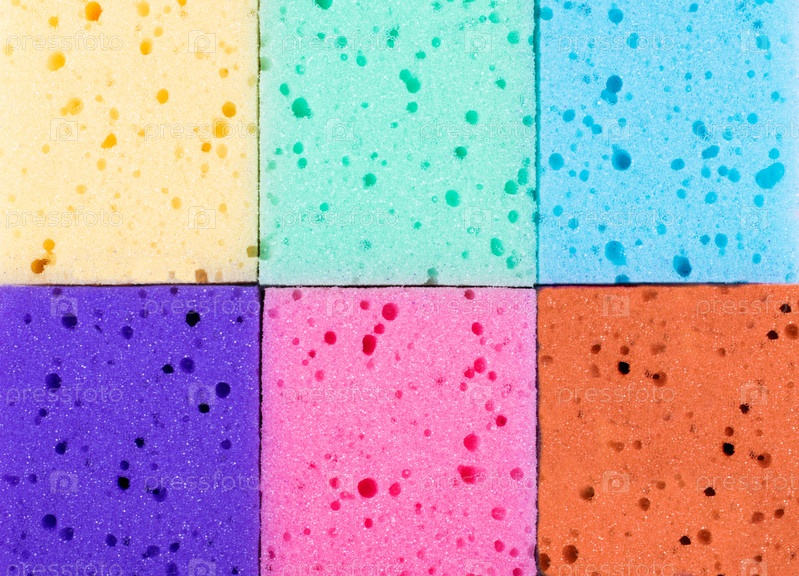 Разноцветные губки для чистки. Синий, зеленый, розовый, желтый, оранжевый и фиолетовый цвета. Копировать пространство