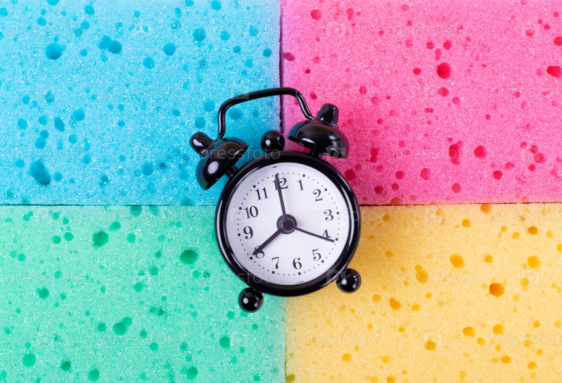 Маленький будильник на разноцветных губках. Время генеральной уборки