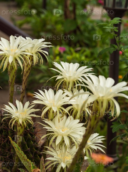 Цветущий кактус с множеством больших белых цветов в летнем саду. Крупным планом изящные цветы кактуса