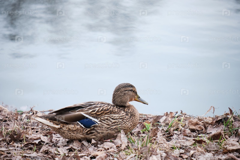 Утка в осенней листве на берегу озера. Крупный план. Копировать пространство