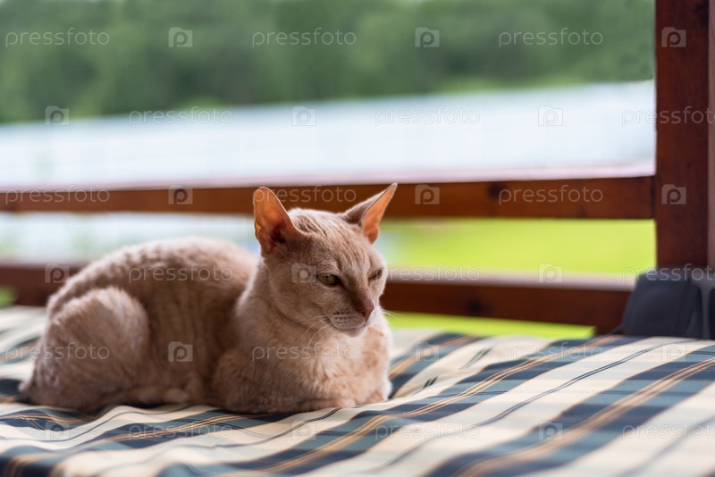 Кошка корниш-рекс лежит, свернувшись калачиком, на клетчатом матрасе на размытом фоне. Крупный план. Выборочный фокус