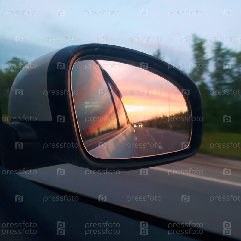 Красивый закат отражается в зеркале автомобиля