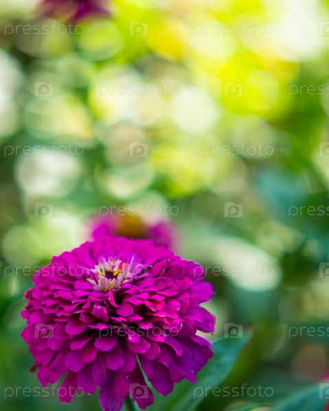 Красочный пурпурно-сиреневый цветок циннии, снятый со стороны в солнечном саду. Крупный план цветущей цинии на размытом естественном зеленом фоне с боке. Элегантные цветы в летнем саду