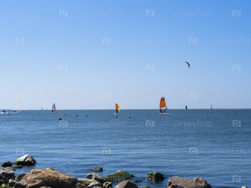 Летний отдых на берегу моря. Сосредоточьтесь на переднем плане. Прогулка по морю на доске с парусом. Виндсерфинг и кайтсерфинг. Красивый летний морской пейзаж