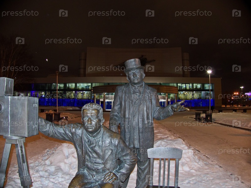 Памятник братьям Луи и Огюсту Люмьер. Зимний вечер. Рядом с фигурами братьев и их изобретением - кинокамерой, поставлен пустой стул для тех, кто хочет сфотографироваться. Екатеринбург, Россия, 20/11/2022