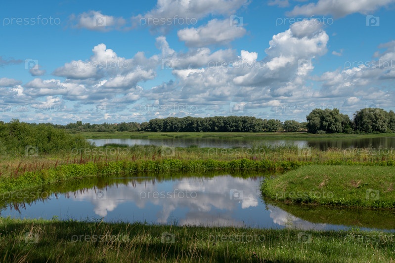 Вид на реку Волхов в солнечный летний день, деревня Витославлицы, Великий Новгород, Россия