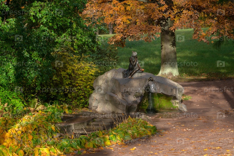 Пушкин, Санкт-Петербург, Россия, 10.09.2022: Вид на фонтан "Девушка с кувшином" в Екатерининском парке в Царском Селе в солнечный осенний день