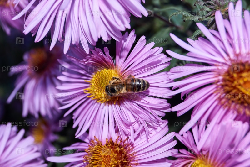 Пчела (лат. anthophila) собирает нектар и пыльцу из цветов многолетней астры