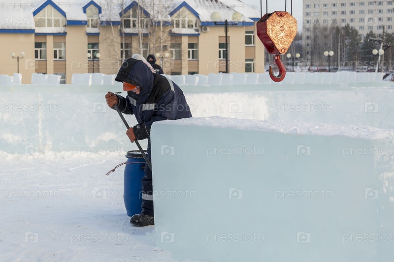 Рабочий лом-сборщик перемещает ледяную глыбу