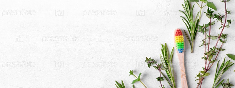 Веб-баннер с бамбуковой зубной щеткой с радужной щетиной и травами на белом фоне. Гигиенический инструмент из биоразлагаемых экологически чистых материалов. Натуральный растительный продукт для ухода за зубами или освежитель дыхания. Макет с копией простр