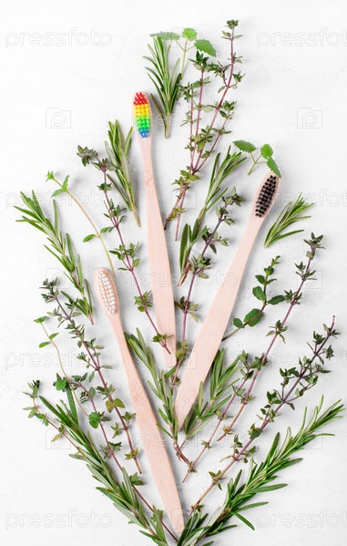 Бамбуковые зубные щетки с радужной, черно-белой щетиной и травами на белом фоне. Гигиенический инструмент из биоразлагаемых экологически чистых материалов. Плоская планировка