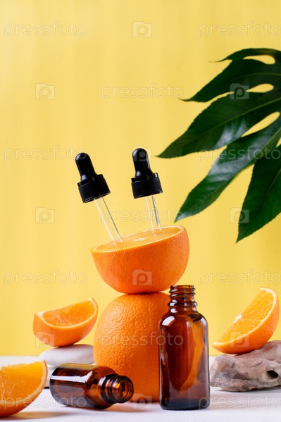 Пипетка в оранжевых фруктах на желтом фоне. Средство по уходу за кожей с цитрусовой кислотой. Креативная презентация