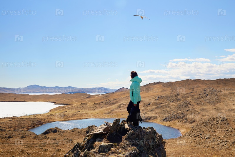 Озеро Байкал, остров Ольхон весной. Женщина стоит на скале и любуется прекрасным видом на озеро Сердце